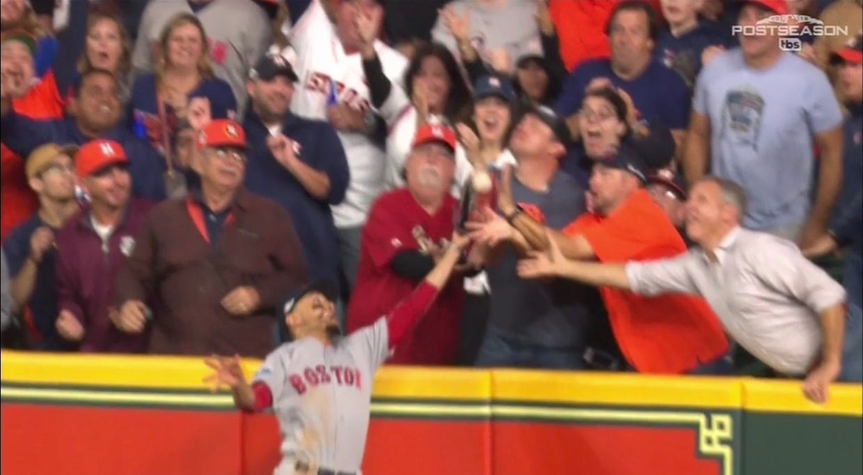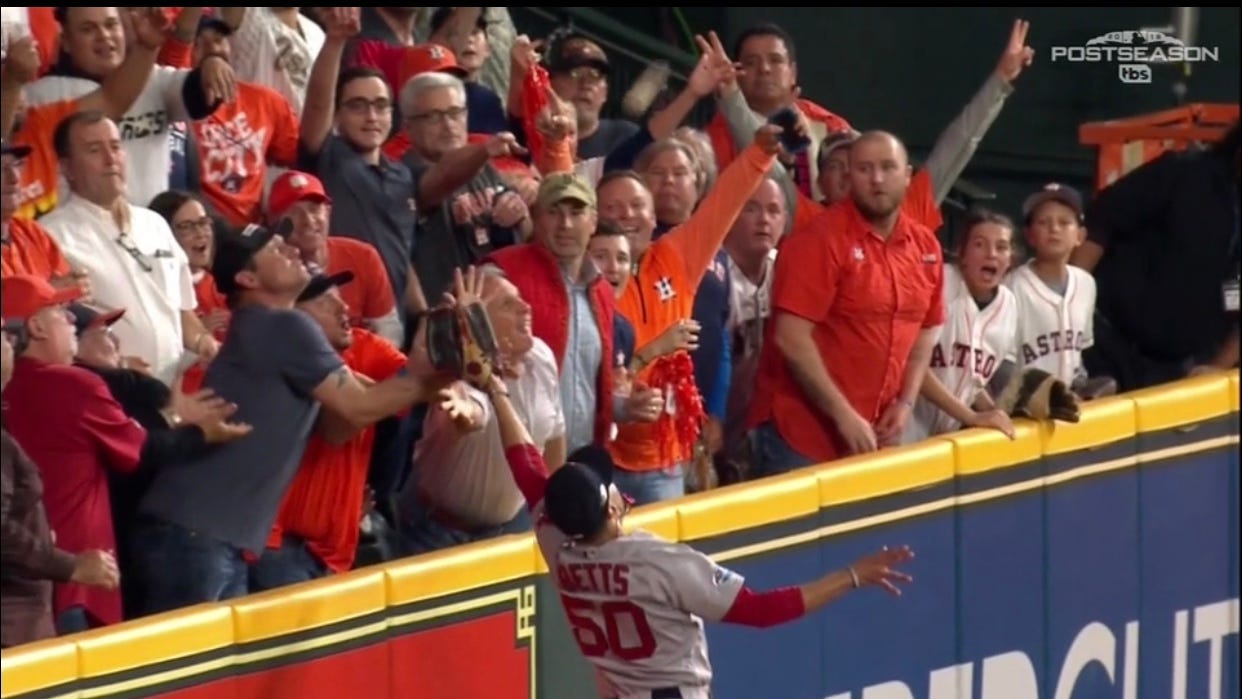 I don't think Altuve should have been called out, I don't think those fans should feel like they did anything wrong, and I don't think you can take away the very real possibility that Mookie Betts would have made that catch.